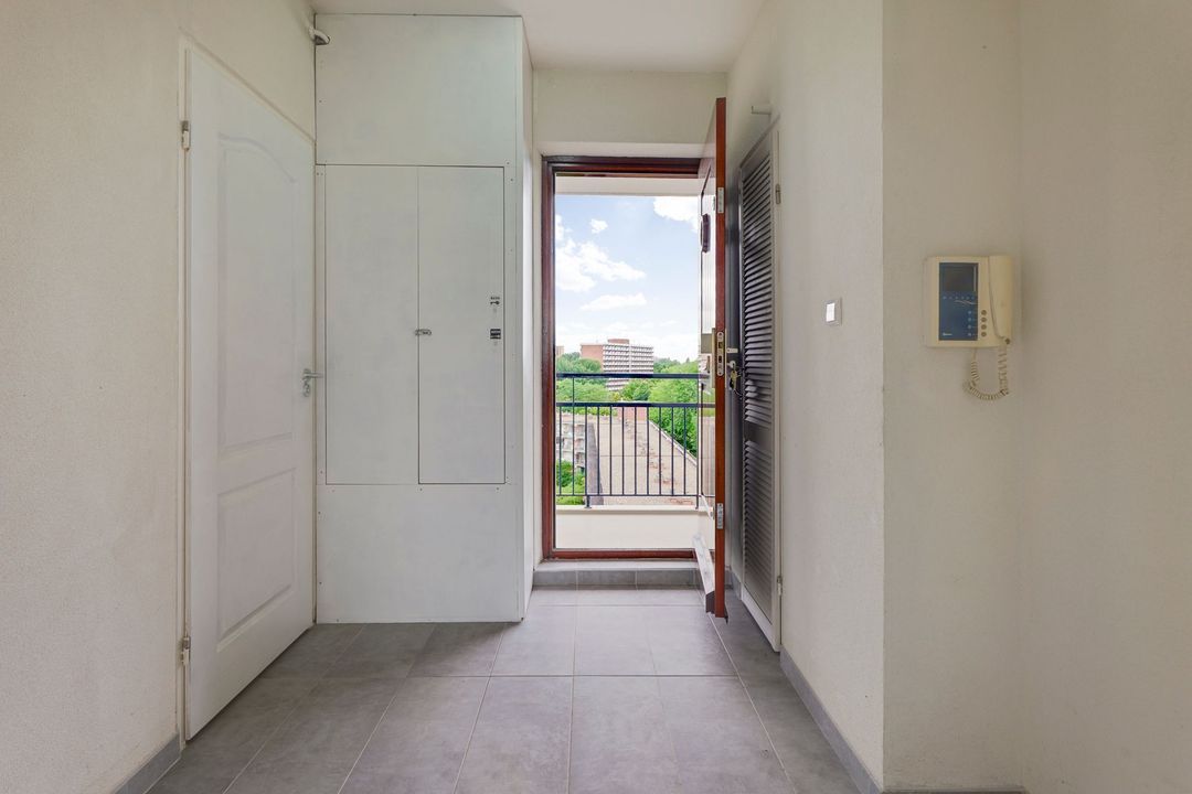 Entree van de woning op de achtste verdieping. Hal met aparte toiletruimte. De woonkamer is voorzien van veel licht door het grote raam. De nette, half open keuken is voorzien van inbouwapparatuur en biedt voldoende ruimte.
