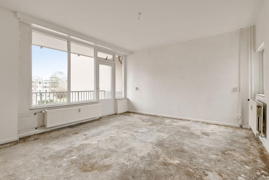 De ruime woonkamer geeft toegang tot het balkon. Doordat de woning is gelegen op de hoek en de vele ramen zorgt dit voor een mooie lichtinval in de woning.
