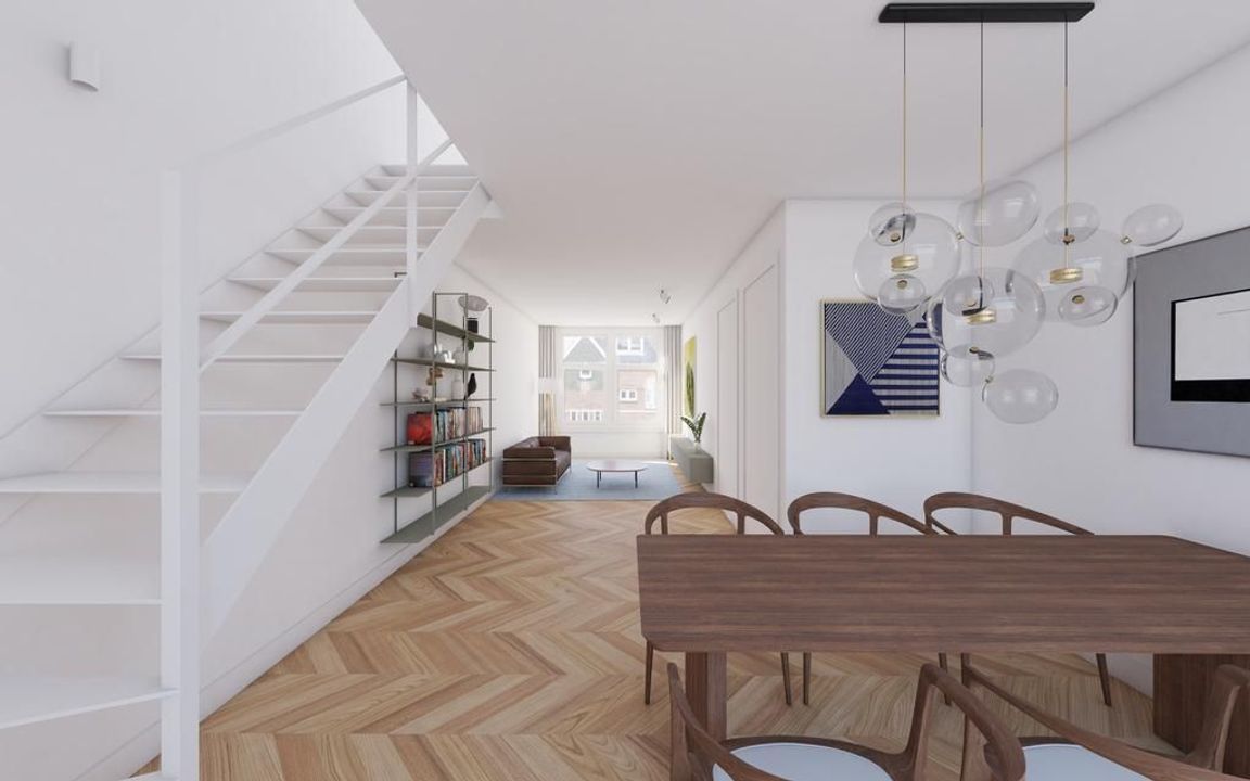 Het appartement op de derde verdieping heeft een slaapkamer aan de voorzijde en een woonkamer met half open keuken aan de achterzijde met toegang tot het balkon. De badkamer heeft een douche en toilet. Op de vierde verdieping bevindt zich een grote kamer welke nog samengevoegd dient te worden.