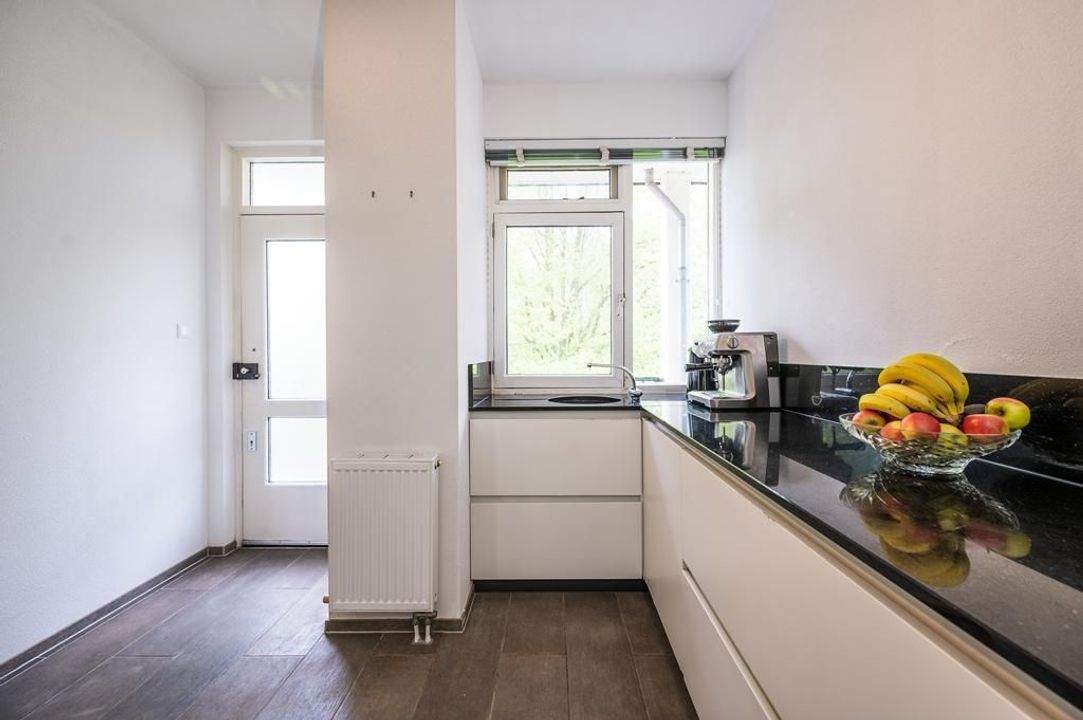 De halfopen keuken bevindt zich bij binnenkomst direct aan de linkerzijde. De moderne keuken is voorzien van een gaskookplaat, vaatwasser, losstaande koelkast en U kijkt uit op de groene binnentuin. Naast de keuken ligt de ruime moderne badkamer met inloopdouche, toilet en wastafel. Zowel de badkamer als keuken zijn voorzien van vloerverwarming.