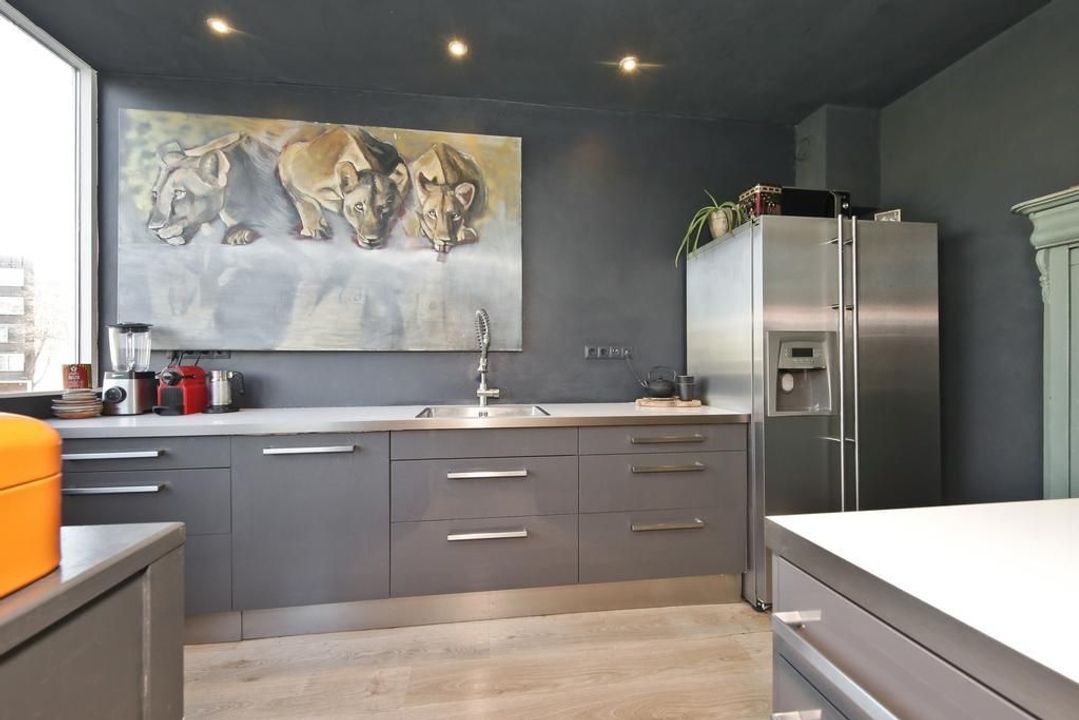 Overloop/hal, lichte doorzonwoonkamer met open keuken met diverse inbouwapparatuur.